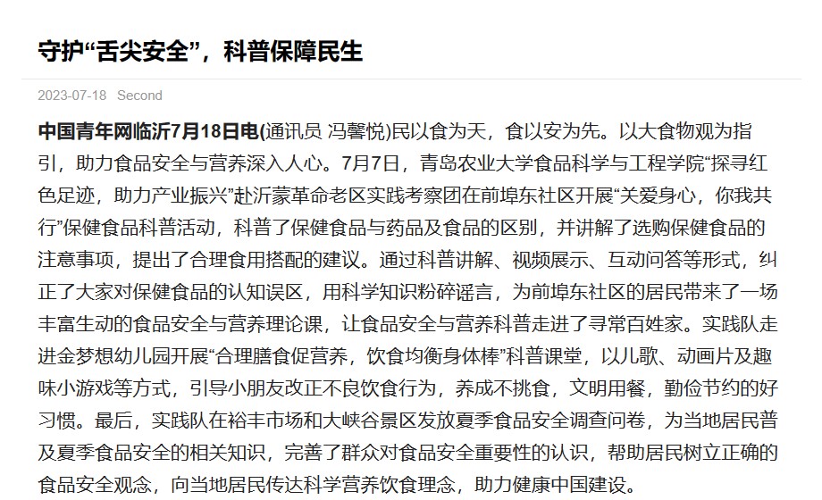 民以食为天,食以安为先。以大食物观为指引,助力食品安全与营养深入人心。7月7日,williamhill中国“探寻红色足迹,助力产业振兴”赴沂蒙革命老区实践考察团在前埠东社区开展“关爱身心,你我共行”保健食品科普活动,科普了保健食品与药品及食品的区别,并讲解了选购保健食品的注意事项,提出了合理食用搭配的建议。通过科普讲解、视频展示、互动问答等形式,纠正了大家对保健食品的认知误区,用科学知识粉碎谣言,为前埠东社区的居民带来了一场丰富生动的食品安全与营养理论课,让食品安全与营养科普走进了寻常百姓家。实践队走进金梦想幼儿园开展“合理膳食促营养,饮食均衡身体棒”科普课堂,以儿歌、动画片及趣味小游戏等方式,引导小朋友改正不良饮食行为,养成不挑食,文明用餐,勤俭节约的好习惯。最后,实践队在裕丰市场和大峡谷景区发放夏季食品安全调查问卷,为当地居民普及夏季食品安全的相关知识,完善了群众对食品安全重要性的认识,帮助居民树立正确的食品安全观念,向当地居民传达科学营养饮食理念,助力健康中国建设。