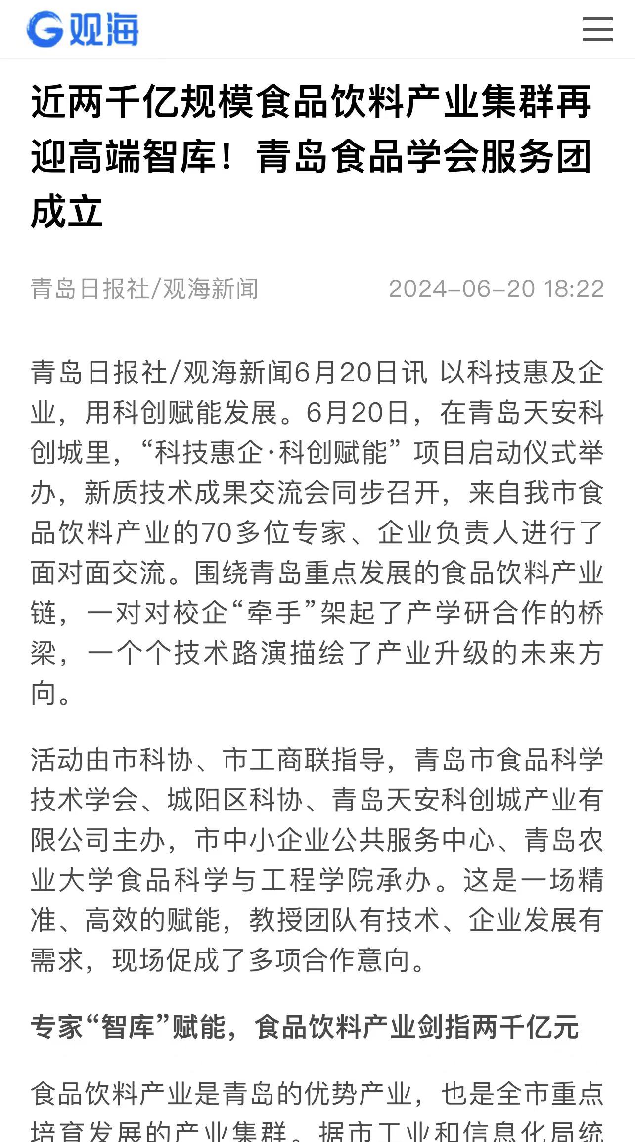 有专家曾这样评价食品饮料产业:这可能是市场变化最为频繁的行业之一,消费的多元化、个性化、品质化不断驱动着产业转型升级。以科技创新赋能产业创新,青岛探索以会企服务的方式,把学会的优质科技资源下沉到企业,促进产学研深度融合,合力推动食品饮料产业高新技术创新应用和高质量发展。