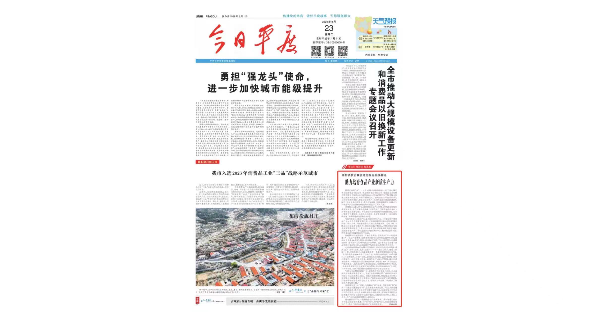 “我们正在谋划续建新厂区,借助政府和大学鼎力相助,企业这次向预制菜新赛道进军,让‘胜家'食品香飘世界。”青岛胜家食品有限公司总经理燕立国说。说起目前的发展,青岛海之圣生物工程有限公司副董事长王元正表示:“我们企业正在扩大研发规模,引进生物和食品等本科专业人才,这次和大学合作,正好解决了研发型人才短缺问题。