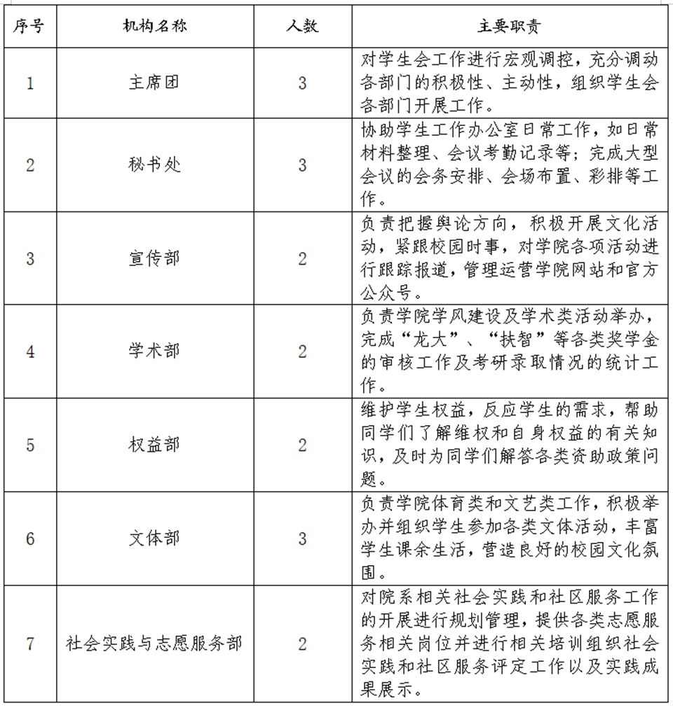 第二十一条 学生会下设秘书处、学术部、宣传部、文体部、权益部、社会实践与志愿服务部。学生会若需主办的重大工作或活动,则以项目化方式招募志愿者。