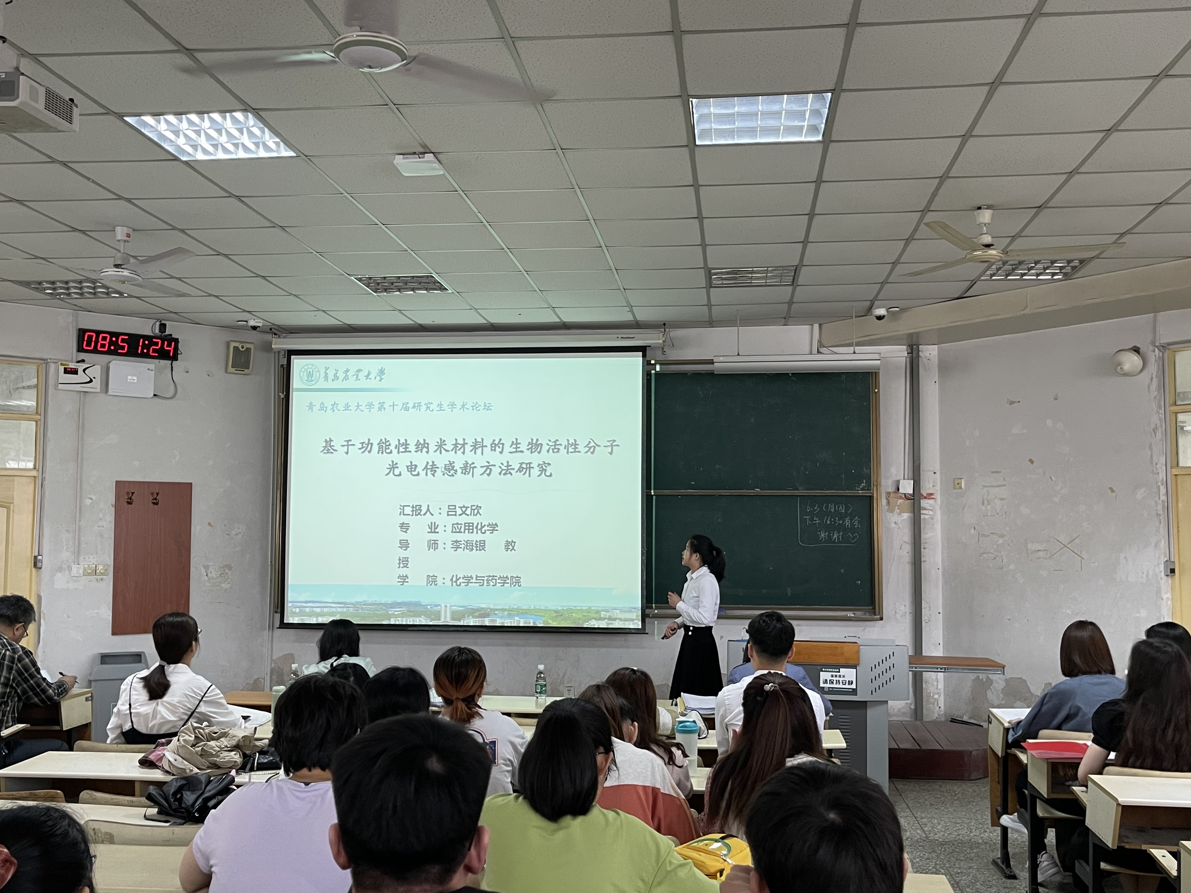 参加答辩评选会的六位优秀研究生分别就各自研究内容做了精彩的学术报告。其中,食品学院王琦同学的现场报告获得了与会师生的一致好评,她展示了在检测食品过程中使用三种真菌毒素的核酸适配体作为传感器的研究,在观察测定真菌毒素的污染情况后,确定了以核酸适配体作为传感器的新型真菌毒素检测方法,为高效、准确的检测真菌毒素提供一种新的方法。化药学院吕文欣同学基于功能性纳米材料的生物活性分子光学传感新方法研究进行了汇报,它总结了现阶段的科研进展,对新方法的实验数据分析进行了详细讲解,逻辑严谨、思路清晰。评审专家逐一点评,就各位同学的研究内容进行了深度的交流与探讨。现场同学踊跃提问、气氛热烈。经过评委专家组的综合考评,最终韩传武同学获得一等奖,马超群、王琦获得二等奖,孙雨静、吕文欣、于萌婷三等奖。