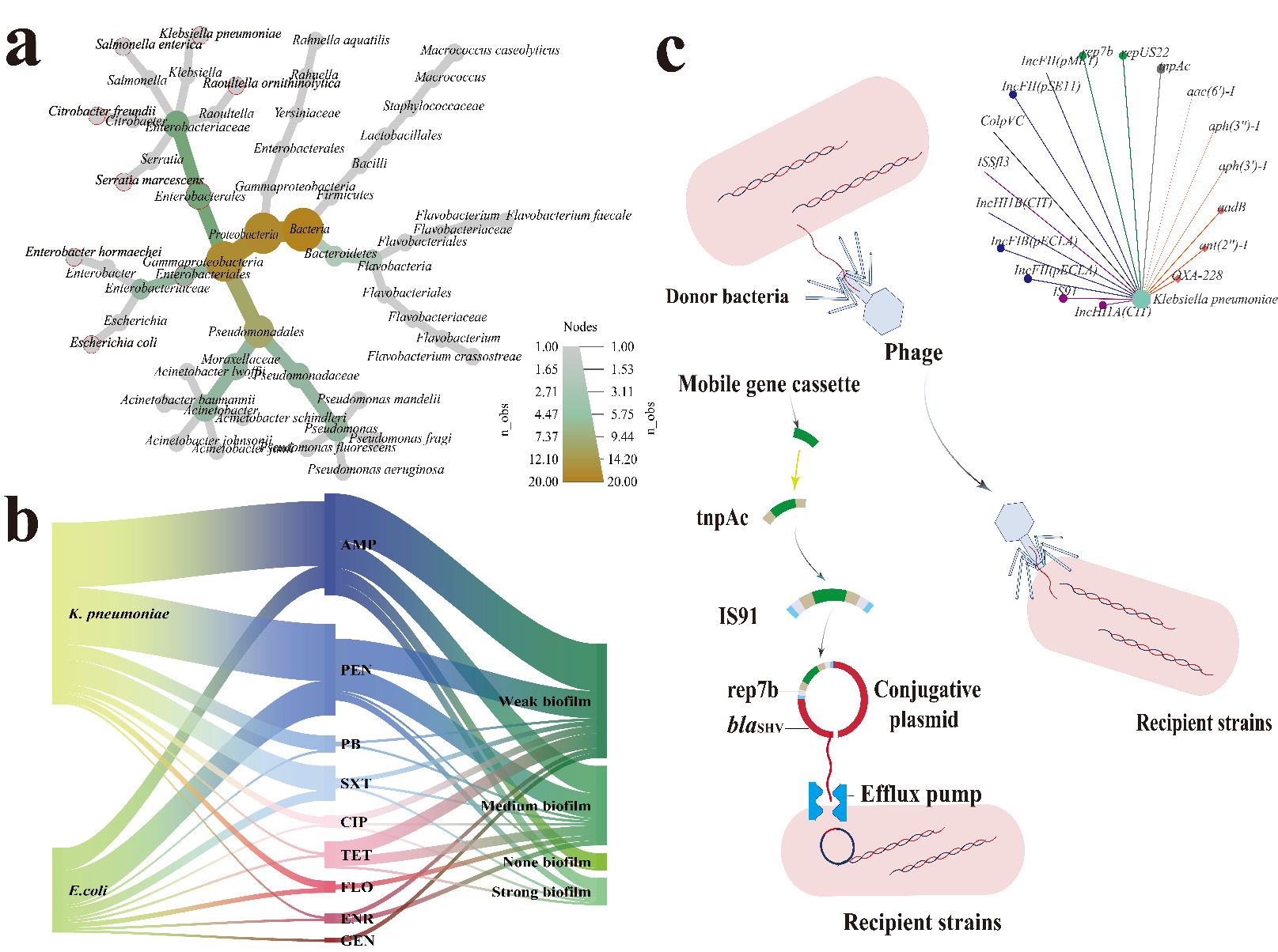 针对以上问题,研究团队聚焦集约化养殖模式下,生牛乳中高风险致病菌的群落组成与分布规律、高风险致病菌污染途径的确定以及致病菌耐药基因的种类、传播机制开展系统性研究。本团队选取42家规模化奶牛牧场作为研究对象,累计采集539份涵盖生牛乳、养殖环境及挤奶设备等的样本,通过宏基因组等技术开展致病菌分布规律研究。对样本分离培养后,分离得到肺炎克雷伯氏菌(49.1%)、大肠杆菌(38.6%)。进一步对耐药性分析发现肺炎克雷伯氏菌多重耐药率高达25%,对β-内酰胺酶类抗生素抗性尤为显著,耐药基因 blaSHV 检出率高达82.14%。结合宏基因结果分析发现可移动元件IS91、IncFII与肺炎克雷伯氏菌中耐药基因显著相关,经接合实验证实借助可移动元件可将 blaSHV 基因分别通过水平转移至同菌种、大肠杆菌、金黄色葡萄球菌,转移频率分别为3.3×10-5,8.6×10-6,6.1×10-6,证实该耐药基因具备跨种属传播潜力。此外,研究还发现细菌生物被膜形成能力与β-内酰胺类抗生素耐药性增强存在显著相关性(P<0.05),提示生物被膜在维持细菌耐药性方面发挥重要作用。