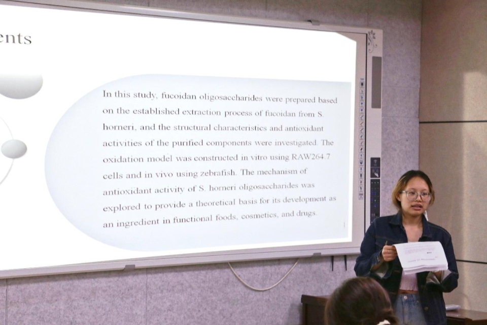 5月8日,食品学院在食品楼302举办第四十四期“食学研讲”活动。本次活动由食品加工与安全专业2024级研究生张洋洋担任主讲,主题为“马尾藻角质岩藻多糖寡糖:纯化、表征和抗氧化作用”。