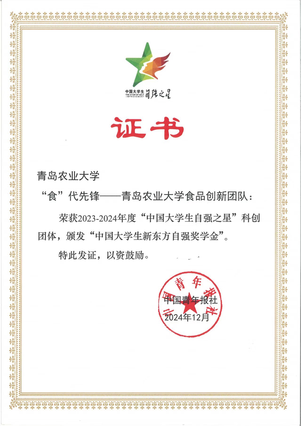 “中国大学生自强之星”推选活动由共青团中央、全国学联指导,团中央基层建设部、中国青年报社、新东方教育科技集团、中国青年创业就业基金会联合举办,自2007年起已连续举办17年,共产生1.2万余名“中国大学生自强之星”。本年度推报活动以“自信自强 挺膺担当”为主题,号召广大青年在科技创新、乡村振兴、绿色发展、社会服务、卫国戍边等各领域各方面挺膺担当,展现新时代中国青年有理想、敢担当、能吃苦、肯奋斗的风采。经学院申报、学校审核、省级初评、全国终审等环节,共产生1610名“中国大学生自强之星”个人、100个“中国大学生自强之星”科创团体和32个优秀组织单位。