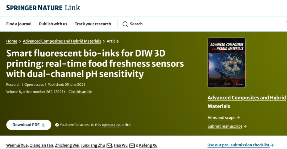 近日,williamhill中国吴昊教授课题组在国际权威期刊《Advanced Composites and Hybrid Materials》(中国科学院一区TOP期刊,影响因子23.2)发表了题为“Smart fluorescent bio-inks for DIW 3D printing: real-time food freshness sensors with dual-channel pH sensitivity”的重要研究论文。课题组基于直接墨水书写(DIW)三维打印技术,成功构建了一种具有双通道pH敏感性和可视化变色功能的实时食品新鲜度传感器,实现将多功能双通道荧光探针与先进3D打印技术深度融合应用于食品安全监测,为食品品质的非破坏性、实时监控提供了可持续创新解决方案。