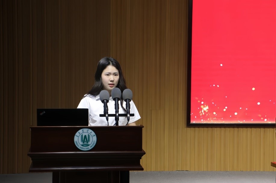 在校生代表、2024届研究生会执行主席冷丰羽发言,她结合自身科研体会,分享三点经验:一是坚守初心、不懈奋斗,不畏失败、厚积薄发;二是尊师爱友、敬业乐学,善用资源、团队协作;三是明确目标、充实生活,劳逸结合、张弛有度。她鼓励新生在科研道路上勇于探索、乘风破浪,为食品领域贡献智慧与力量。