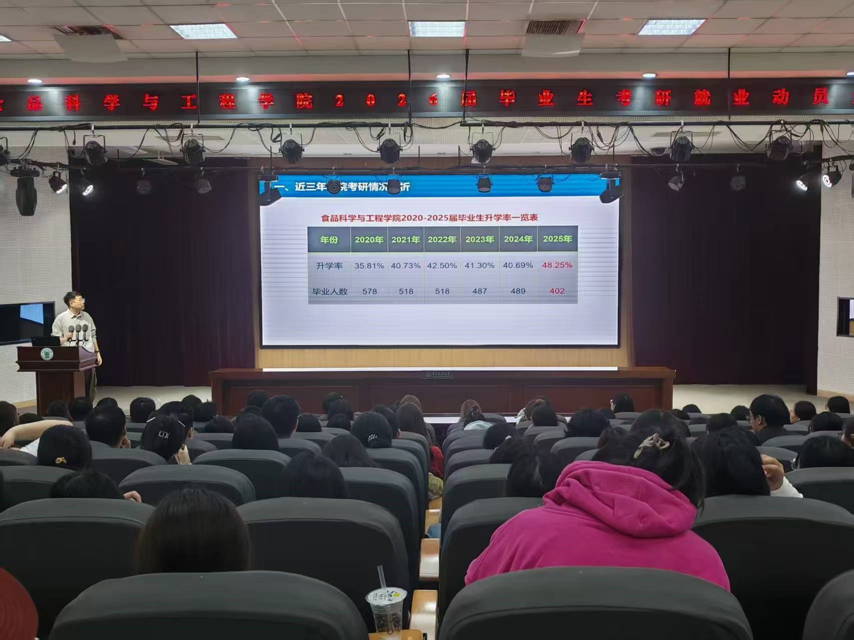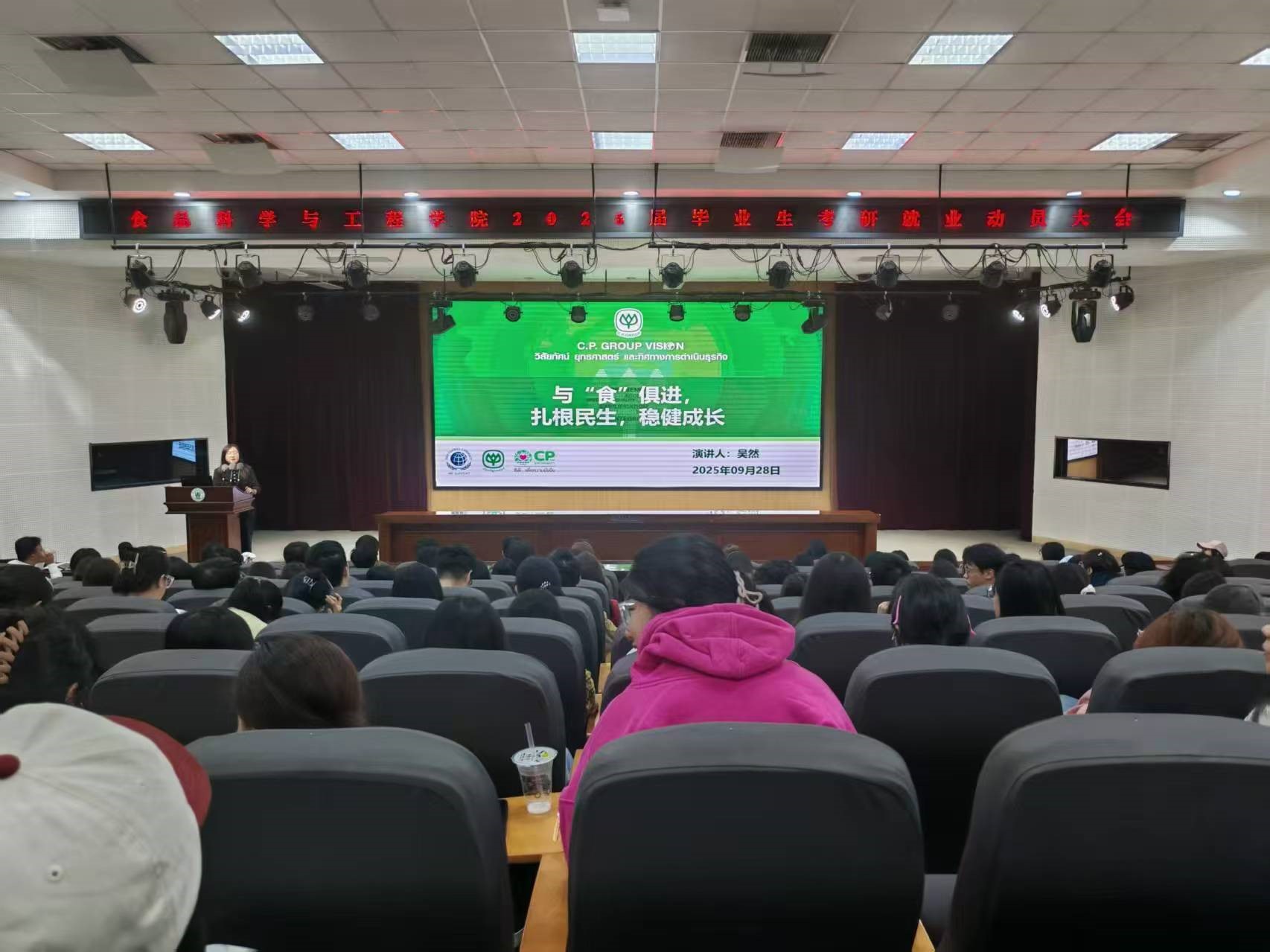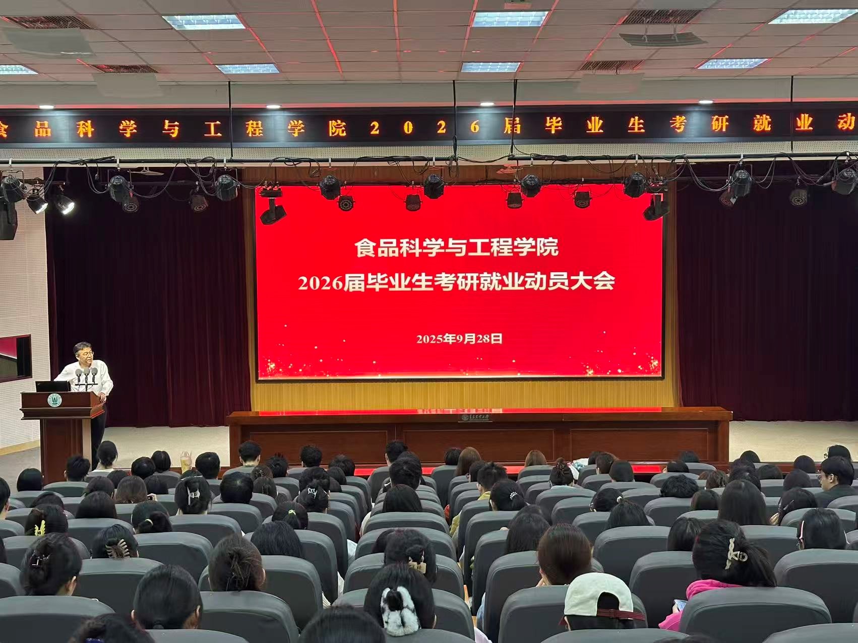 会上,车广杰以自身工作经历为切入点,从“信心、选择、目标、行动”四个方面对2026届毕业生做了动员。他提出,面对人生的关键十字路口,首先要坚定“信心”,食品行业是永远的朝阳产业,在健康中国与乡村振兴战略交汇点上,专业人才正迎来前所未有的发展机遇。关于选择,他建议同学们立足专业特色,将个人兴趣与国家需求相结合,“无论是深耕科研还是服务产业,每个岗位都能绽放光彩”。在目标设定上,他提醒要“跳一跳够得着”,既仰望星空又脚踏实地。最后在行动层面,他号召大家立即启动“三早计划”:早定位、早准备、早行动,用今天的全力以赴换取明天的从容不迫。