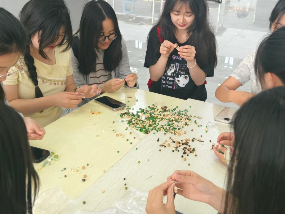 本次彩虹跑创新设置动态、静态活动,让二者共同开展,其中设有8个动态关卡分布于学校各处,各队伍需按抽签路线完成打卡。在“车轮滚滚”关卡中,食品学院的队员们协作推动圆环前进;“一圈到底”里,他们手拉手穿越呼啦圈让团队凝聚力在协作中提升;此外还有“极速五子棋”“有轨电车”等关卡,也从专注力和知识储备等多角度,让同学们在挑战中感受团队协作的乐趣与心灵成长的喜悦。在农史馆内的静态活动区域,串珠DIY体验区也聚集了许多同学,学校提供的各种多元材质的珠子,为同学们提供了广阔的创意空间。食品学子十分积极地参与活动并且乐在其中,通过穿引、排列、固定等工序,将抽象的情绪转化为可触碰的艺术载体。